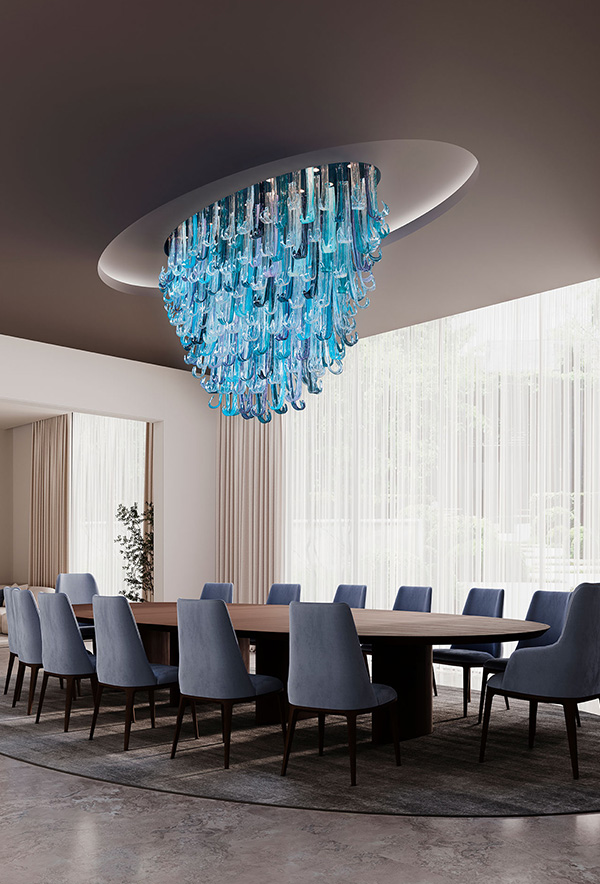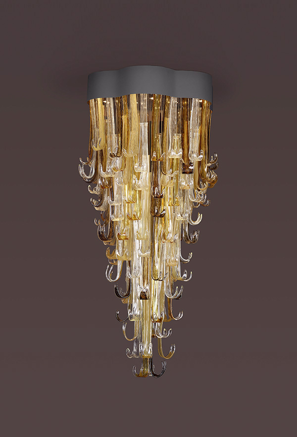 Inspired by the wonders of water and steam of a natural geyser. The intrinsic force of a geyser carries a blend of aggressiveness and beauty in an unlikely harmony between strength and fragility, establishing the basis of the Geyser Collection. The glass primacy of this rich design embodies the piece with vigour and energy aiming towards the most intense visual lighting experience. Visually impressive, its design falls into the category of collections with greater expression, achieving a status of lighting sculpture.
